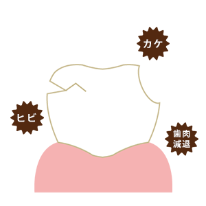 知覚過敏の主な原因として「ひび割れ」「欠け」「歯肉の減退」などがあります。
